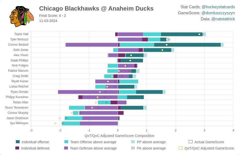 It was pretty disheartening to see the Blackhawks at the very bottom of the NHL standings on Halloween night following that loss to San Jose, because we were all told by the GM that this team was going to start taking steps forward. Sandwiched around that loss to the Sharks were a trio of wins, ultimately taking six of the 10 points available on this five-game road trip. So, yeah, the results are nice. But the way this team is winning games is not exactly a harbinger of future success. Anaheim had a 2-to-1 or better advantage on most 5-on-5 stats from this game: 70-35 in shot attempts, 40-13 in scoring changes, 19-7 in high-danger chances … all adding up to a 68.47 percent goal share. The win in LA was similarly lopsided in the opponent’s favor. The wins can suffice for now, but it would be more encouraging if there were better signs of collective 5-on-5 play coinciding with these victories.