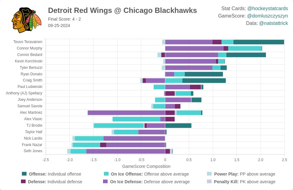 Kevin Korchinski had a similar giveaway in his own end while on the power play that also led to a quality scoring chance for Detroit. It’ll probably get used in the case being built to send him to Rockford at the start of the season. The score card below did have him as one of the better skaters from the game, though.