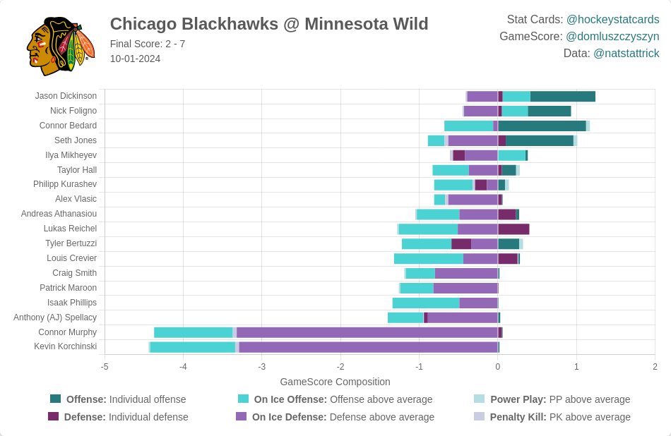 Oh right, the game. The tricky part is trying to find something good to say about this events because everything went so far downhill so quickly that it’s hard to remember anything positive. Kevin Korchinski had a few bad giveaways that led to goals. His D partner, Connor Murphy added one a little later. The line of Lukas Reichel, Andreas Athanasiou and Taylor Hall would have been an improvement if it had been a non-factor based on how detrimental it was to the team’s overall success in this game. Tyler Bertuzzi and Ilya Mikheyev took bad/dumb penalties that resulted in Minnesota PPGs. The possession stats from Natural Stat Trick are comically lopsided. Everything was bad!