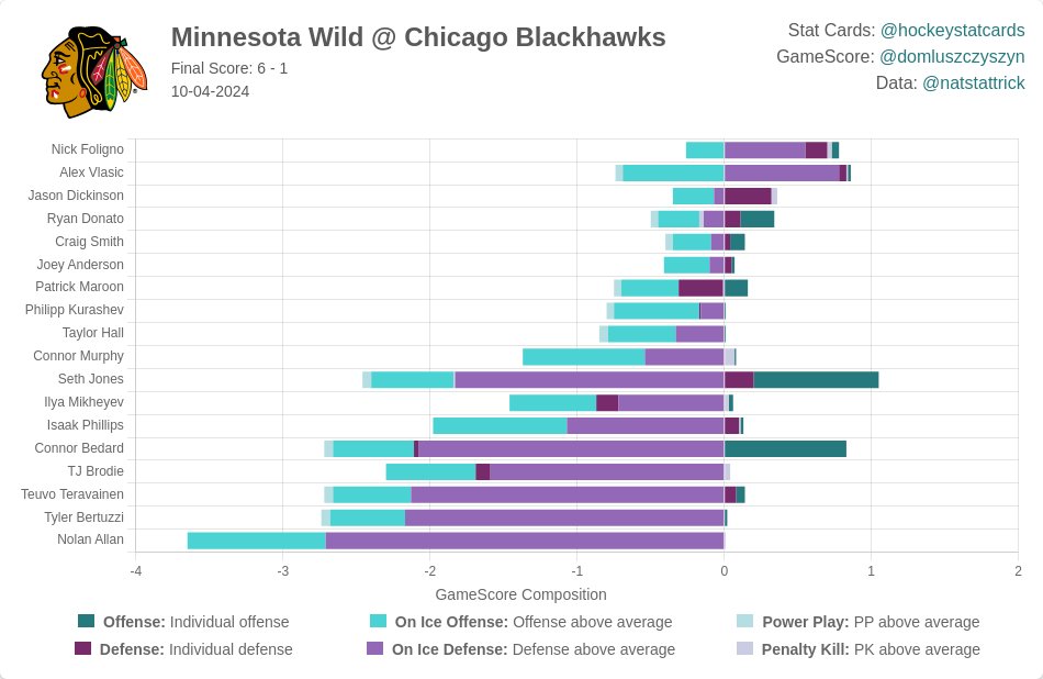I’m going to keep this short because the score basically told the game: the Blackhawks were outplayed, they had no offense, and the Wild cake-walked to another rout. The second period was better than the first and third but, let’s be honest: that was a low bar to step over. And it absolutely felt like the Wild were just cruising versus the Blackhawks actually tightening up defensively. I mean, Chicago immediately gave up a goal against right after they scored, and as I said above, it looked effortless. All of Minnesota’s goals did, really. It’s frustrating.