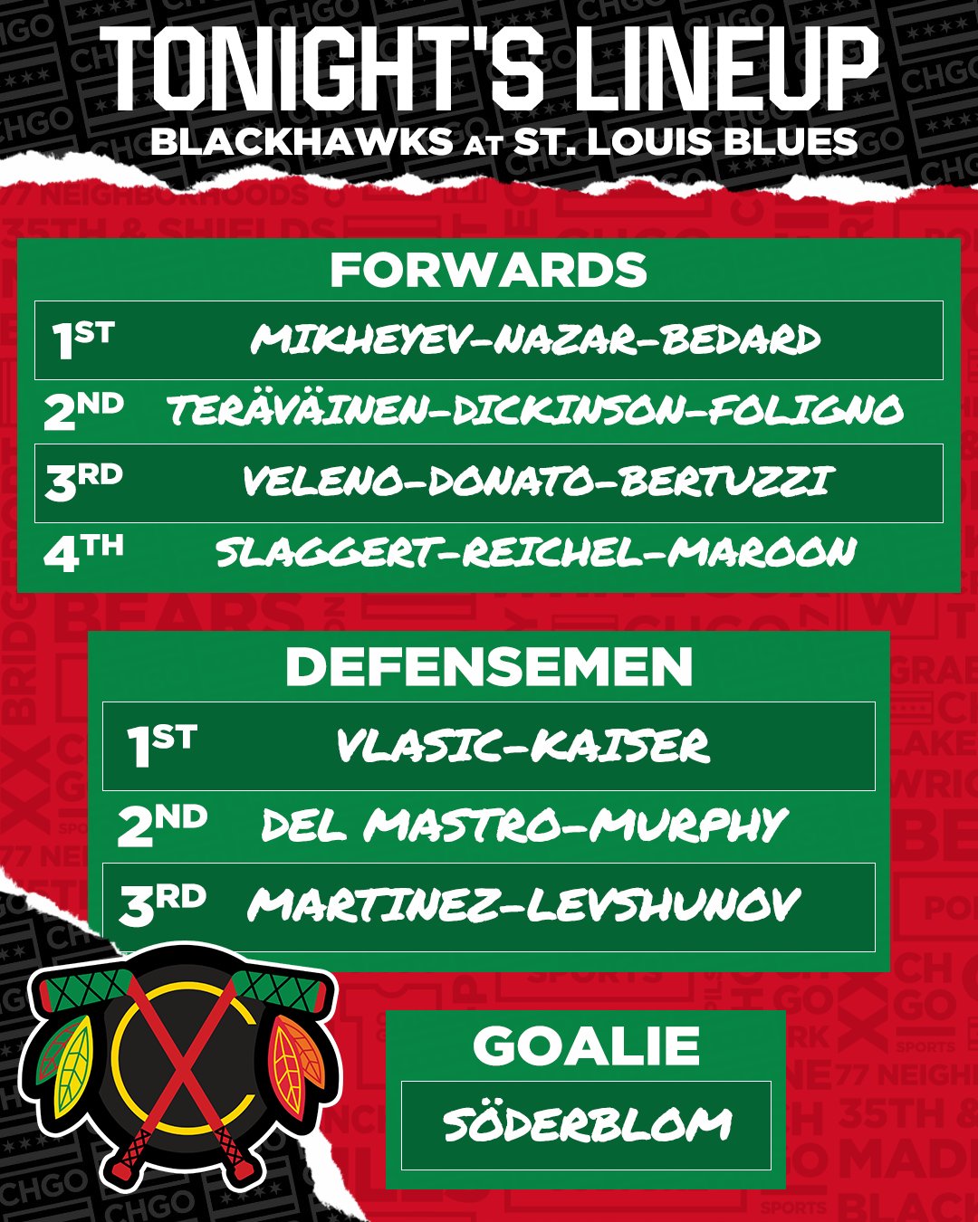 As for the Hawks, the lineup will be anyone’s guess after Jason Dickinson and Alec Martinez both departed Saturday’s loss early and did not return. Below is how they started against St. Louis. The only educated guess of an adjustment that can be made is Spencer Knight relieving Arvid Soderblom in net. Everything else will be learned when the Hawks take the ice for the pregame skate.