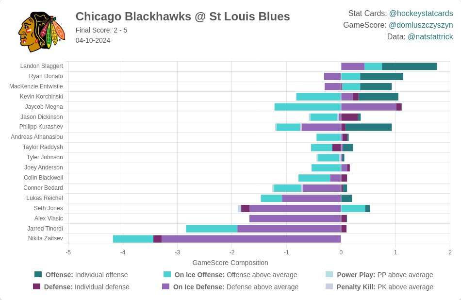 - One of the worst first periods this season, which is saying something. Obviously four goals on the first four shots is terrible, but the Blues also just dominated in every way by a large margin. The Blackhawks had 17 fewer shot attempts and 10 fewer scoring chances at 5-on-5, not even hitting double digits in either category. Embarrassing, as Jason Dickinson described in post-game:
