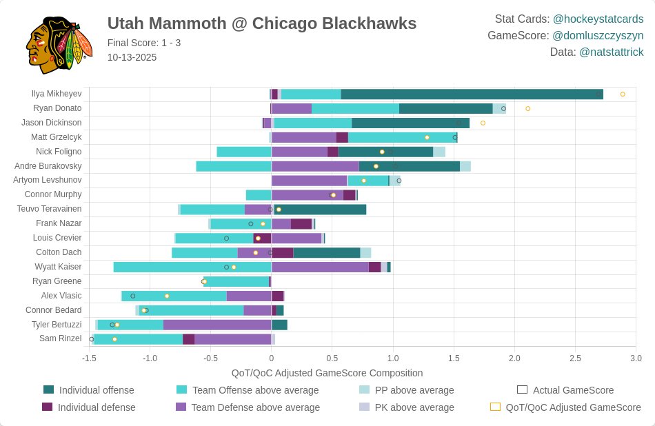 And they did just that in the opening minutes of the third period. The Blackhawks responded well, though, pushing back strongly right after the goal against and keeping things fairly even with the Mammoth until score effects kicked in following Chicago’s power-play goal. This period resembled the first, where shot possession still leaned toward Utah (Blackhawks at 35 percent of shot attempts) while quality slightly favored Chicago (52.44 percent).