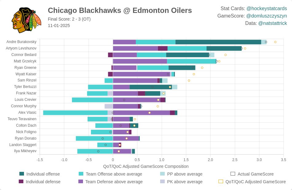 Next time the Blackhawks play the Oilers, perhaps slightly more emphasis should be placed on NOT taking penalties. Throw out the special teams and the Hawks controlled a good amount of the play, with overall advantages of 52-49 in shot attempts, 25-20 in shots on goal, and 9-5 in high-danger chances, all adding up to a 57.5 percent share of the expected goals during 5-on-5 play in this game.