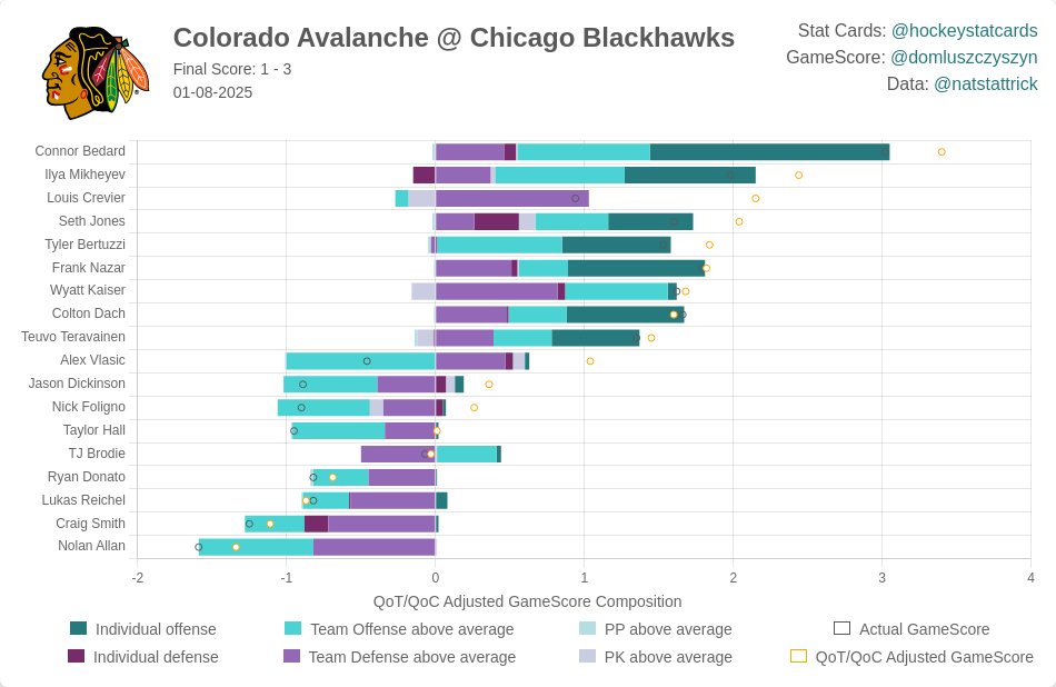 With the Blackhawks up 2-1 heading into the third, it was obvious the Avs would turn it on looking for an equalizer, so the shot stats heavily favor them to start the final frame (17-11 shot attempts, 9-5 shots on goal). However, Chicago not only kept Colorado’s quality low — to just three high-danger chances — the home team was energized after an excellent penalty kill and used that to power through for their third goal. Again, it was exciting to see the Blackhawks not turtle when up by a single goal, instead focusing on both suppressing quality against while also still trying to get an insurance goal.